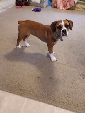Dear Yvonne & Mark, Luna (formerly Lucy) is doing GREAT! We still struggle with her going to the door to let us know she has to go out, so we have been "trained" to take her out every 1 1/2 hours. When she is in her kennel, she does hold it, so we know she can. At 5 1/2 months she loves to play with her toys, but her favorite "toy" is my 4 1/2 year old grandson! They play a lot & he is her "favorite". She eats like a little pig (she thinks she should sit at the table with us....so lots of training there!)!! We don't feed her anything other than her dog food, but she still tries! & LOVES to swim when we bring her to the lake! We were kind of surprised by that. Luna weights 24lbs! She's not very tall, but we really don't know what to expect with her height & weight. I don't think we ever saw pictures of her mom & dad, so I guess we will see how big she gets. If you are able to send a picture of her mom & dad, that would be great to see. We are blessed to have Luna and she brings us much joy. Warm Regards, Tina Devers July 2020
