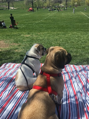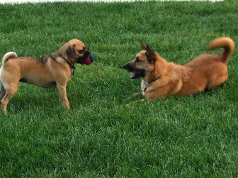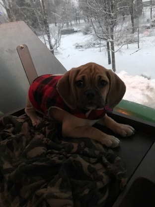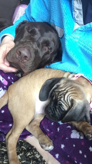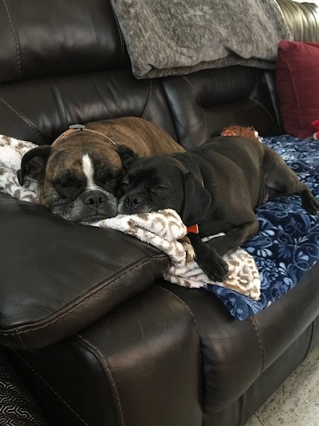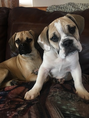 We wanted to give you an update on our puggle Howie and beabull bull Chunk (formerly Bruno). Howie is about 9 months old and Chunk is about 6 months now and they are such good buddies. They play all day long and cuddle in the evenings. Howie is especially sensitive and sweet natured. Chunk is a bull in a china shop and has the coolest, chilled attitude and absolutely loves to cuddle. They balance each other out nicely. Howie is our hiker and Chunk is our napper. Howie is coming to terms with the fact that his little brother Chunk is now taller and larger than him. Thank you for our beautiful puppies...they sure have helped mend our hearts after we lost our puggle Toby. Our hearts are full ❤️ June 2018